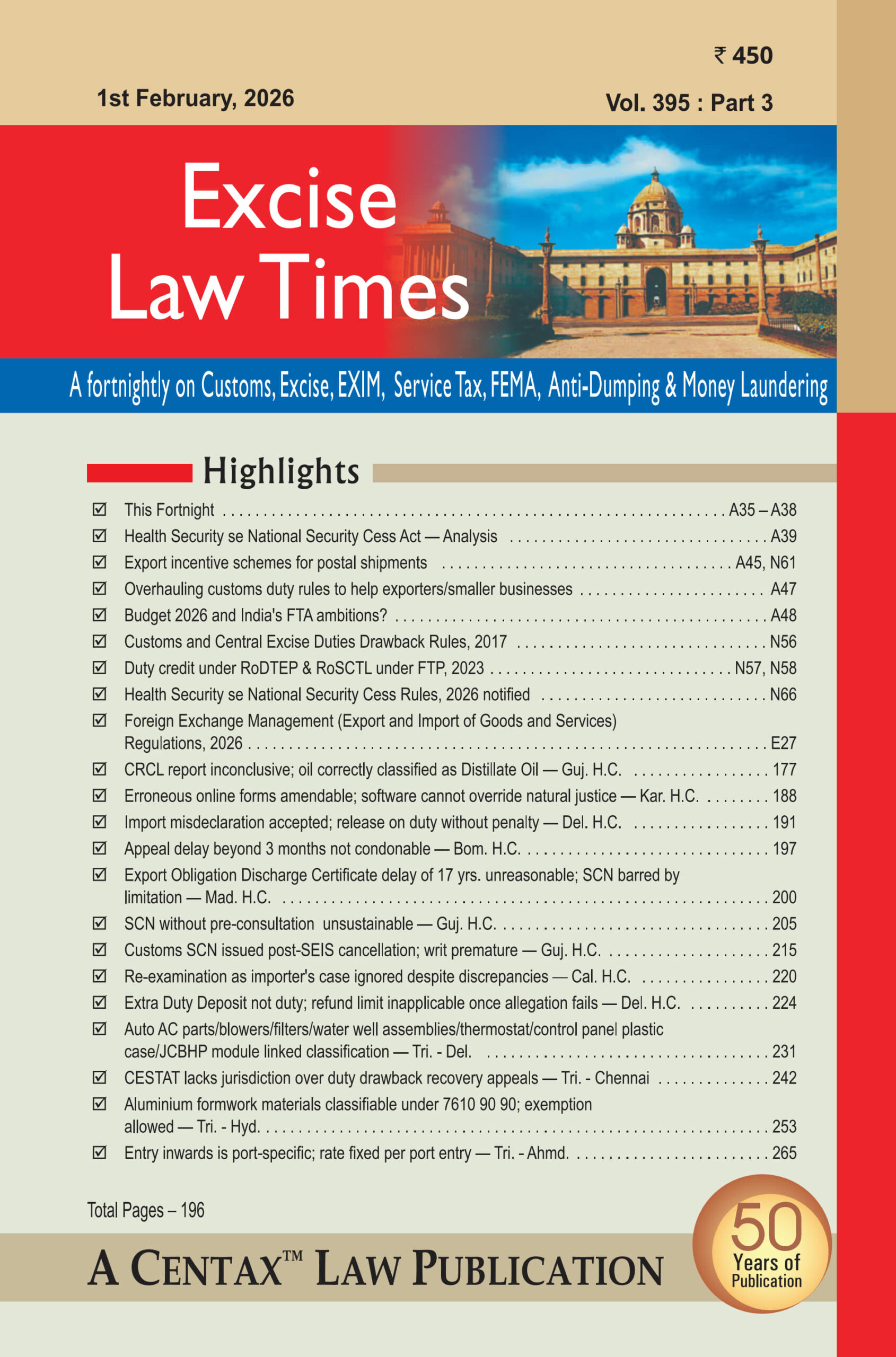 For nearly five decades, Excise Law Times (E.L.T.) has been the premier journal on Excise, Customs, and Exim laws, trusted by tax professionals, manufacturers, and consultants. Published by CENTAX, this fortnightly journal is dedicated to simplifying complex regulations, aiding strategic tax planning, and informing key business decisions.
