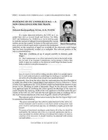 2020 ] BLOCKING OF ITC UNDER RULE 86A — A NEW CHALLENGE FOR THE TRADE J59